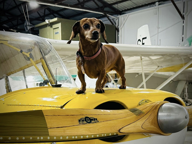 Our museum mascot, Quimby, is a wiener and you can be too! Buy the winning raffle ticket for this remarkable Bellanca Champ and you'll be a wiener! Don't lose out! | |