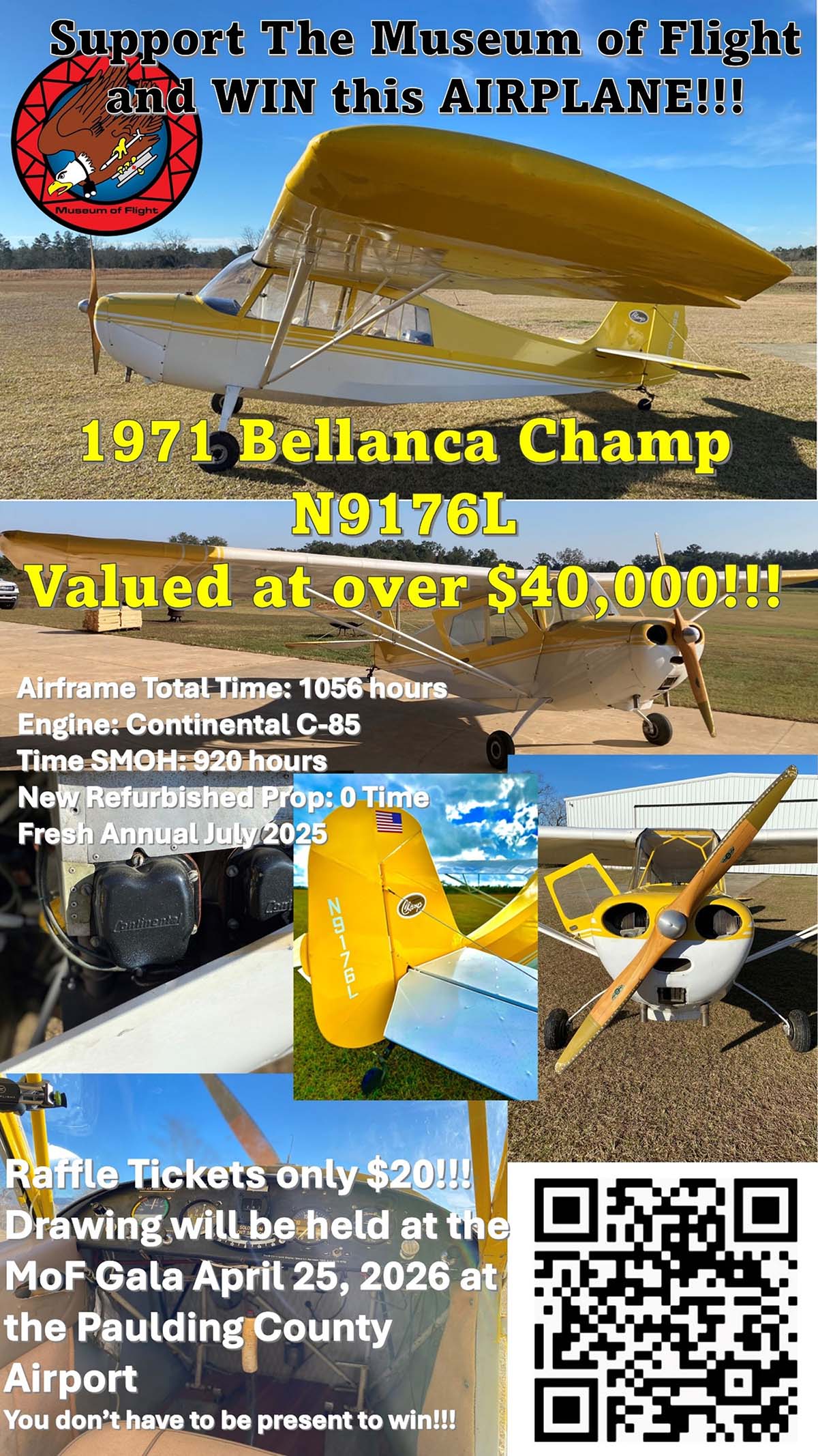 Raffle ticket WINNER will be chosen at the Museum of Flight Annual Gala on April 25, 2026. The raffle is a fundraiser to support the Museum of Flight, Hixson. The winner does not need to be present to win. Contact information must be accurate when submitted. Delivery of the aircraft is the winner’s responsibility. The winner must complete the transfer of ownership and delivery by May 31, 2026 (1 month after winning). | |
